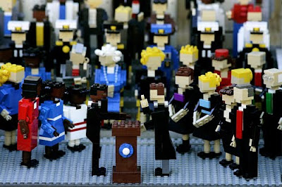 Imagem de uma recriação, em Lego, dos varios protagonistas presentes na varanda em frente ao Capitólio onde decorreu a cerimónia da tomada de posse de Obama.